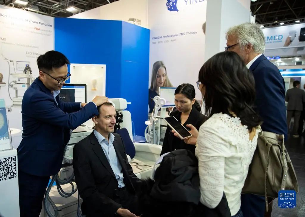 11月13日,在德國杜塞爾多夫國際醫(yī)療器械設(shè)備展,參觀者在英智醫(yī)療展位體驗(yàn)經(jīng)顱磁刺激儀。新華社記者 張帆 攝