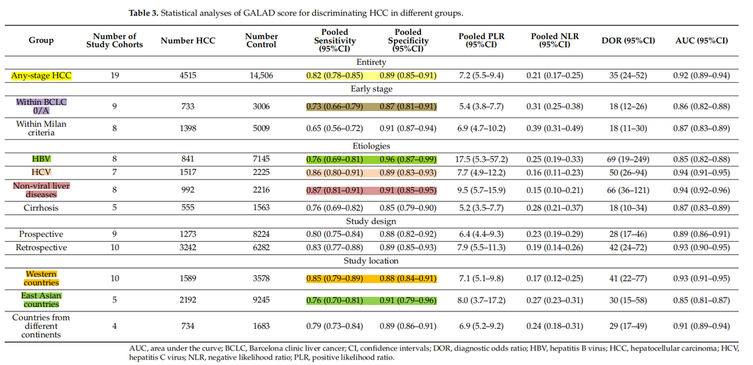 GALAD模型作為一項(xiàng)基于血清生物標(biāo)志物組合的診斷工具,在全球范圍內(nèi)的多種病因引起的肝癌診斷中,包括乙肝、丙肝以及非病毒性肝病所致的HCC,顯示了相對(duì)一致且出色的診斷效能。盡管在以乙肝為主要病因的中國(guó)肝癌患者中其性能有所受限,但總體而言,GALAD模型在區(qū)分HCC與非HCC患者時(shí),特別是在識(shí)別早期和任何階段的HCC時(shí),均體現(xiàn)了較單一血清標(biāo)志物更強(qiáng)的診斷優(yōu)勢(shì)。