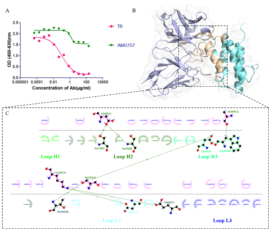 圖1:TSLP-T6復(fù)合物結(jié)構(gòu)分析。(A) ELISA實(shí)驗(yàn)測(cè)定AMG157與T6抗體的結(jié)合表位;(B) TSLP-T6復(fù)合物結(jié)構(gòu);(C) TSLP-T6作用力分析