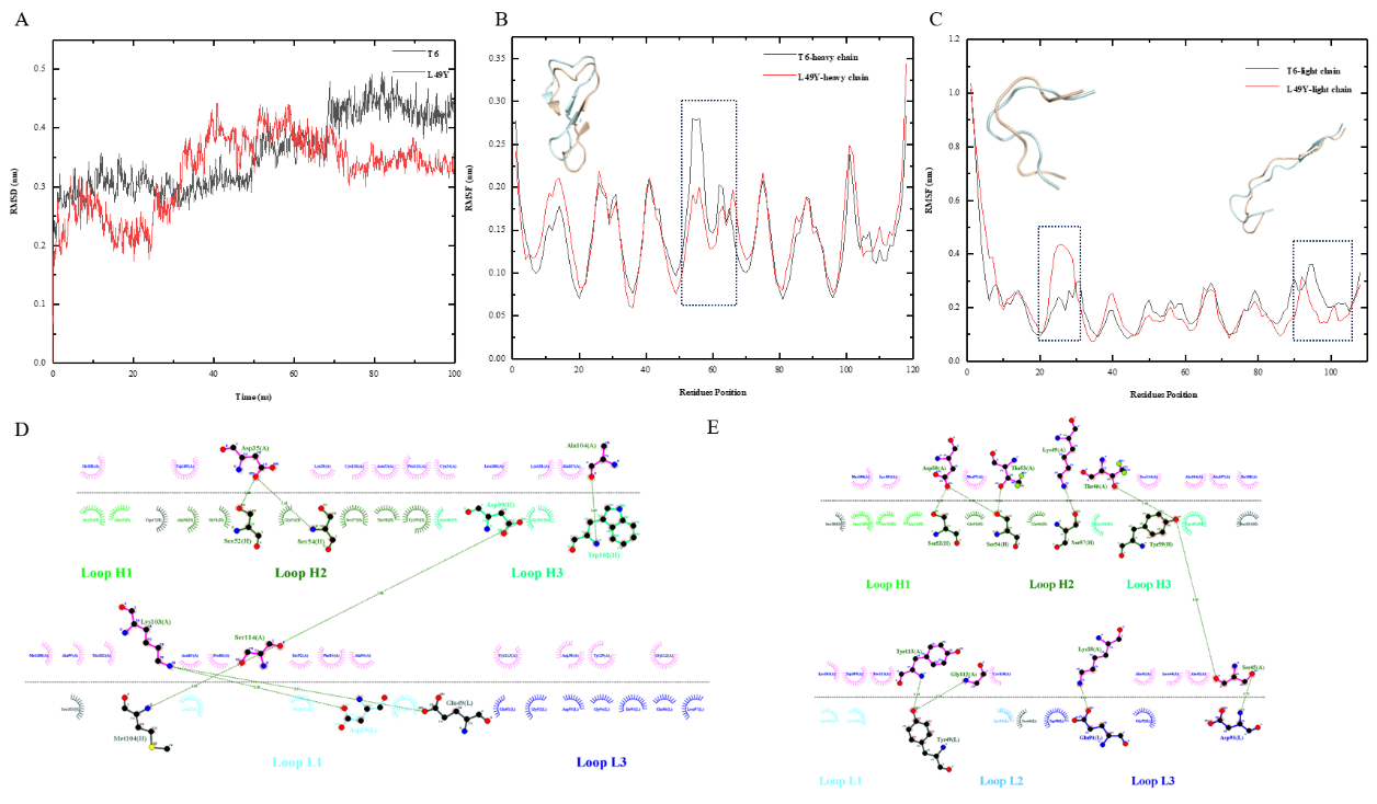 圖2:L49Y動(dòng)力學(xué)模擬分析圖。(A) L49Y模擬過(guò)程RMSD圖;(B) L49Y重鏈模擬RMSF圖;(C) L49Y輕鏈模擬RMSF圖;(D) T6-TSLP相互作用分析圖;(E) L49Y-TSLP相互作用分析圖