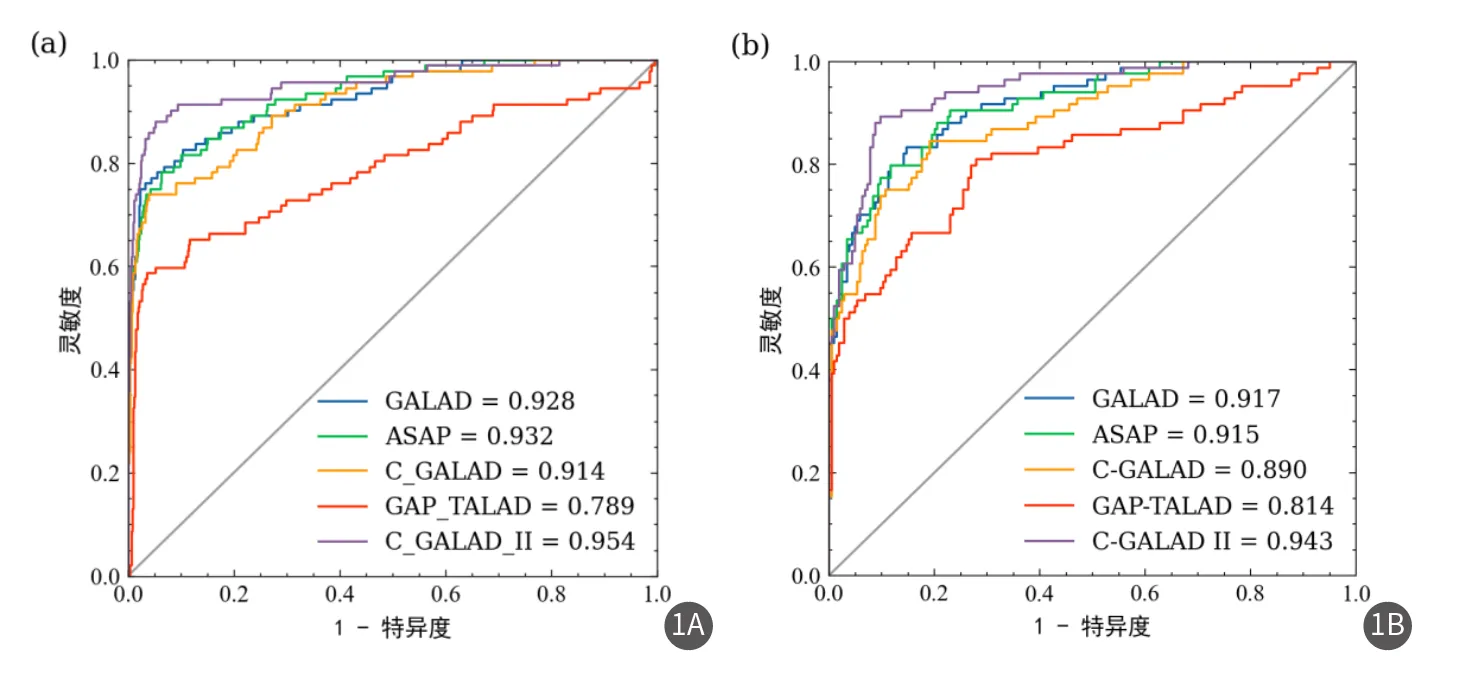 圖1 C-GALAD Ⅱ模型和已報(bào)道的4個(gè)風(fēng)險(xiǎn)預(yù)測(cè)模型在測(cè)試集中和驗(yàn)證集中對(duì)原發(fā)性肝細(xì)胞癌的診斷性能比較(1A 為測(cè)試集,1B為驗(yàn)證集)