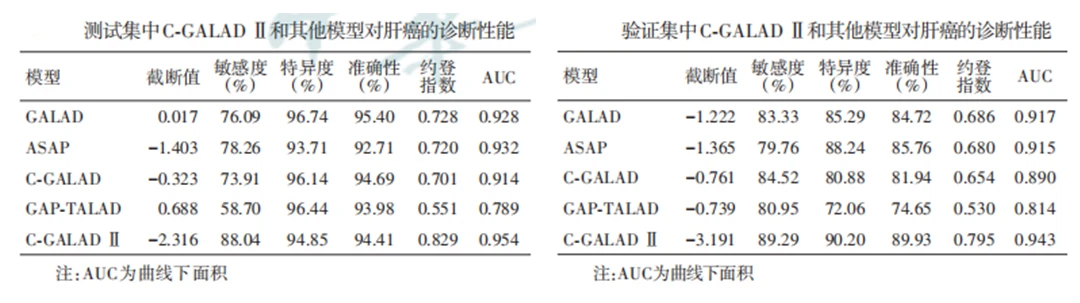 在測(cè)試集上驗(yàn)證C-GALAD Ⅱ所得AUC為 0.954,敏感度為88.04%,特異度為94.85%;在外部獨(dú)立驗(yàn)證集的C-GALAD Ⅱ所得AUC為0.943,敏感度為89.29%,特異度為90.2%,性能優(yōu)于其他已發(fā)表模型。