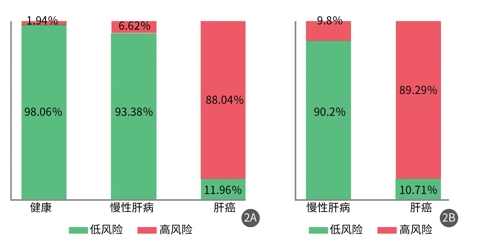 圖2 C-GALAD Ⅱ模型在測(cè)試集和驗(yàn)證集中不同人群的預(yù)測(cè)結(jié)果分布(2A為測(cè)試集,2B為驗(yàn)證集)