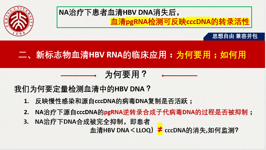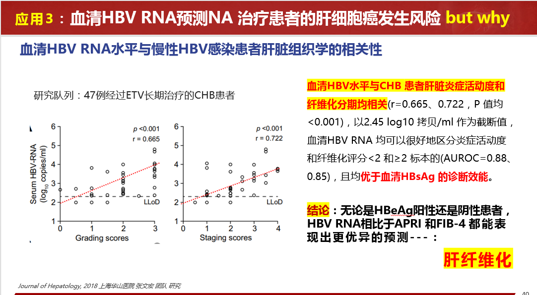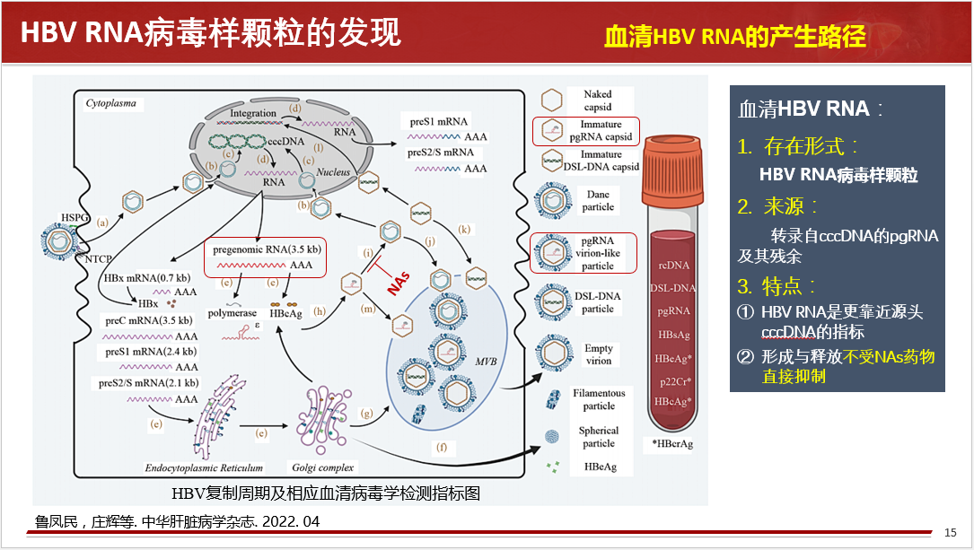 關(guān)于HBV RBA病毒樣顆粒的發(fā)現(xiàn)、血清HBV RNA的產(chǎn)生路徑、存在形式、來源和特點等做了詳細闡述,同時分享國內(nèi)肝病領(lǐng)域張文宏研究團隊等工作成果,血清HBV RNA水平反映肝內(nèi)cccDNA的轉(zhuǎn)錄活性,血清 HBV pgRNA,是NA治療下HBV DNA < LLOQ后,能夠反映患者肝組織內(nèi)是否有cccDNA活躍轉(zhuǎn)錄的唯一指標(biāo)。