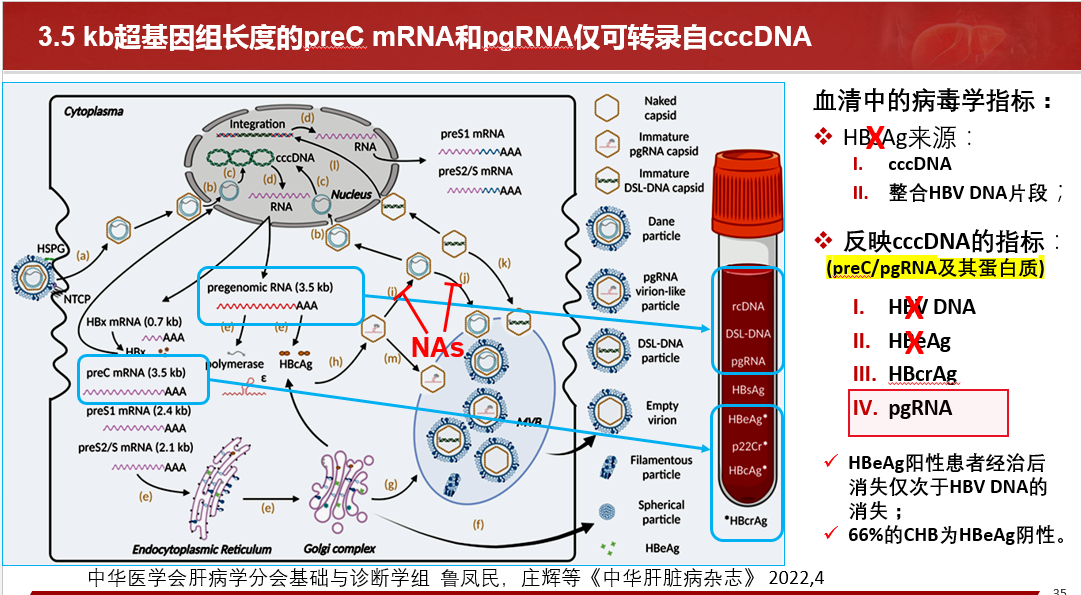 當(dāng)前常用的病毒學(xué)指標(biāo)HBsAg的來源除了cccDNA以外還有整合HBV DNA片段,只有3.5kb超基因組長度的preC mRNA和pgRNA僅可轉(zhuǎn)錄自cccDNA,因而能反映cccDNA的指標(biāo)為pgRNA和HBcrAg。