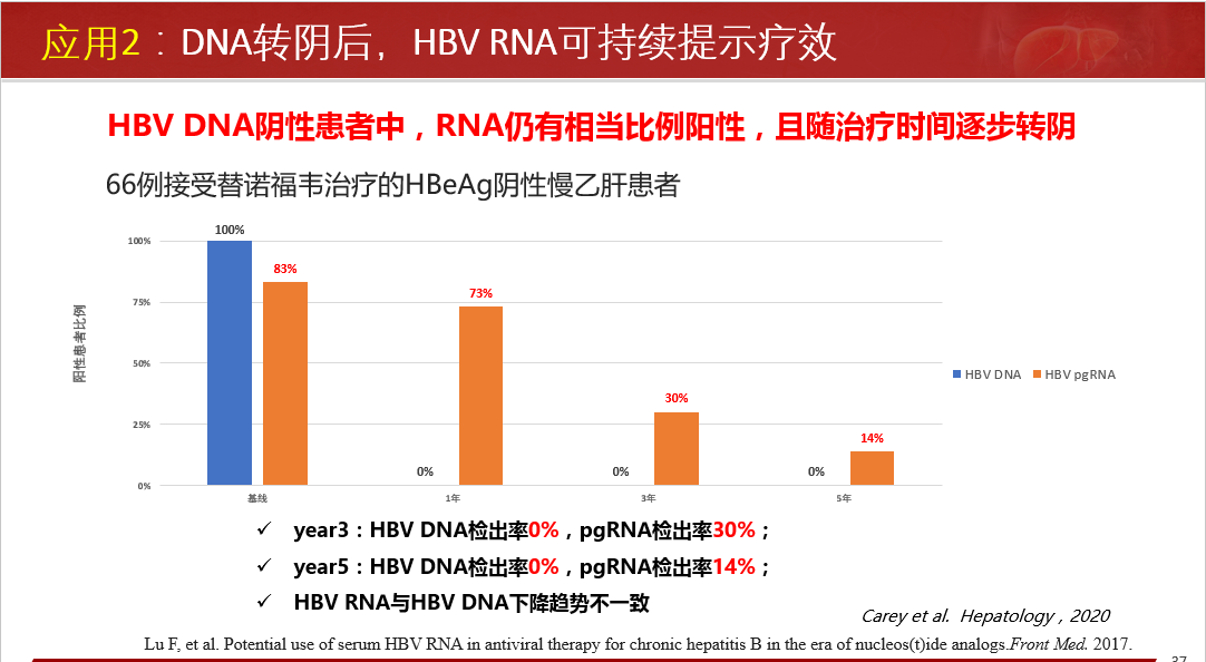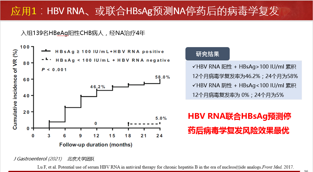 臨床應(yīng)用方面:指導(dǎo)安全停藥;NA治療下患者血清HBV RNA檢測陽性預(yù)示更高的HCC發(fā)生風(fēng)險;NA治療下患者血清HBV RNA檢測陽性,提示病毒cccDNA仍在有效轉(zhuǎn)錄表達病毒蛋白、組裝子代病毒顆粒樣pgRNA病毒顆粒。