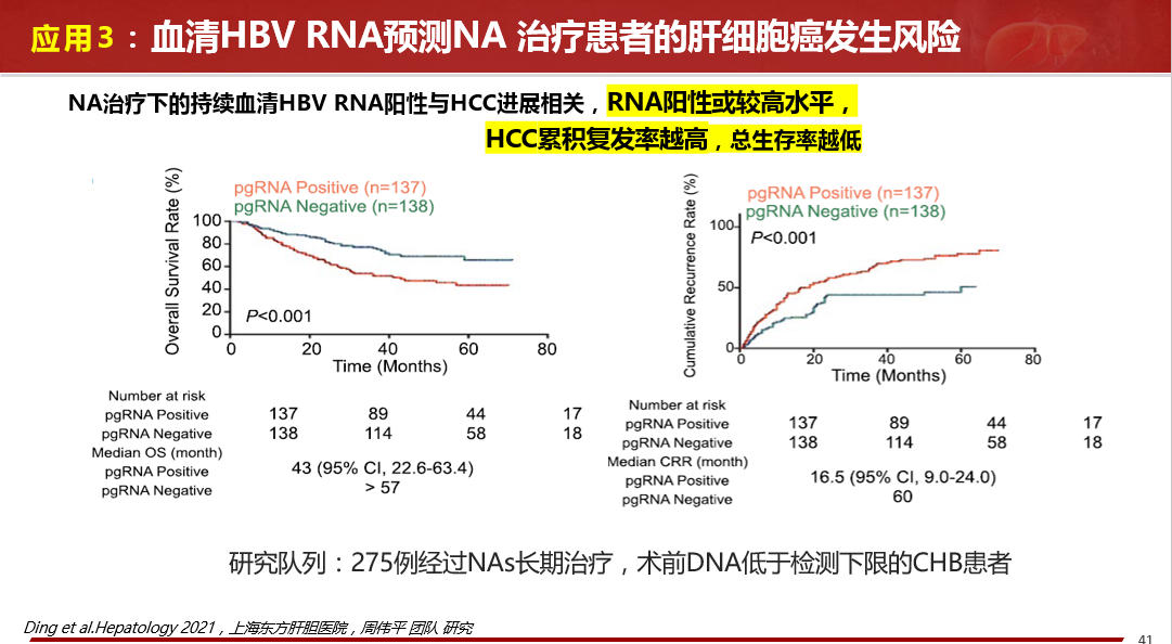 ★ NA治療下的持續(xù)血清HBV RNA陽性與HCC進展相關(guān),RNA陽性或較高水平,HCC累積復(fù)發(fā)率越高,總生存率越低。