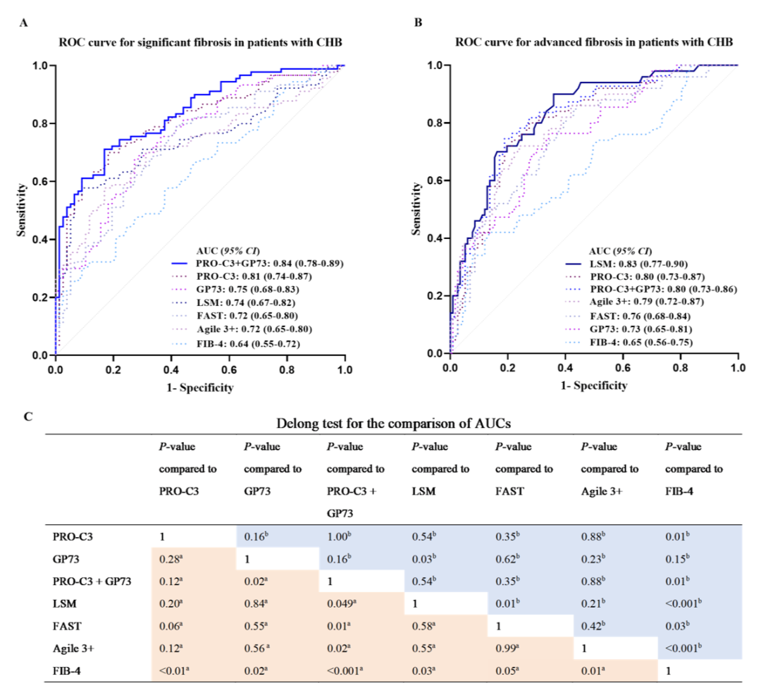 本研究共納入324名初治CHB患者(中位年齡39歲,63.5%為男性),其中167人(51.5%)為顯著纖維化,83人(25.6%)為進(jìn)展期纖維化,167人接受瞬態(tài)彈性成像檢查。結(jié)果顯示,顯著纖維化和進(jìn)展期纖維化患者的PRO-C3和GP73水平顯著高于S0-1和S0-2期患者(P<0.001)。多因素Logistic回歸分析顯示,在校正性別、年齡、體重指數(shù)、肝酶和HBV DNA水平后,PRO-C3和GP73均分別是顯著纖維化(PRO-C3:OR 4.67,95%CI: 2.74-7.96;GP73:OR 2.82,95%CI:1.64-4.85)和進(jìn)展期纖維化(PRO-C3:OR 8.37 95% CI:4.17-16.78;GP73:OR 3.91,95%CI:2.04-7.49)的獨(dú)立預(yù)測因子。