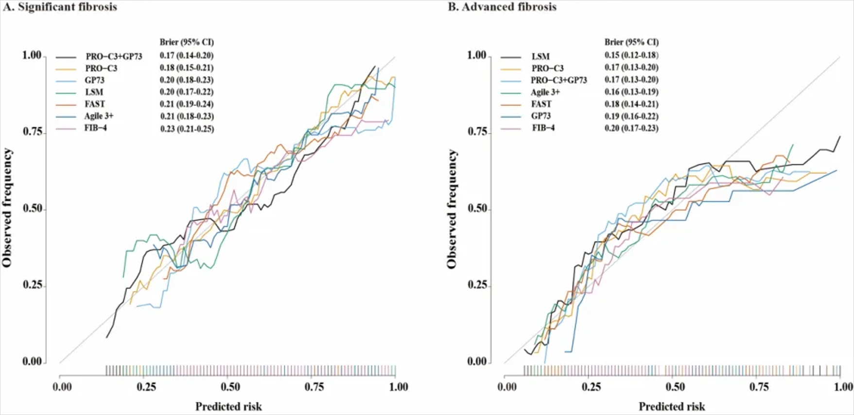 校準(zhǔn)曲線也顯示,在診斷顯著纖維化方面,PRO-C3聯(lián)合GP73的Brier評分最低(0.17),其次是PRO-C3、LSM、GP73、FAST、Agile 3+、FIB-4(圖2A)。在診斷進(jìn)展期纖維化方面,PRO-C3和PRO-C3聯(lián)合GP73模型的Brier評分均為0.17,其診斷效能優(yōu)于FIB-4(0.20)和FAST(0.18)(圖2B)。