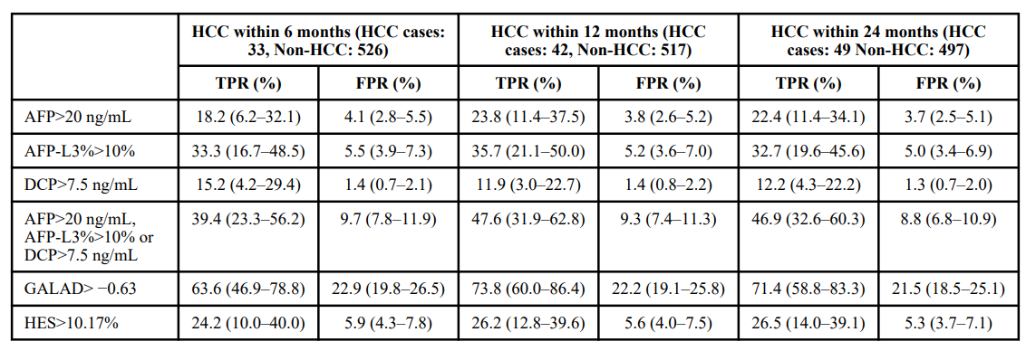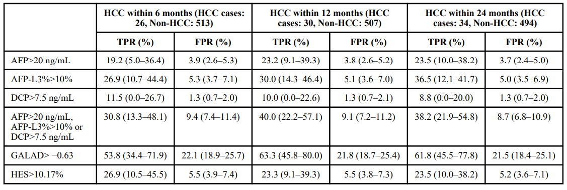 這項研究遵循了嚴格的PRoBE設(shè)計(Prospective-specimen collection, Retrospective-blinded-evaluation,前瞻性樣本收集、回顧性盲法評估,特別適用于癌癥早期檢測和篩查研究。),從534名病毒性肝炎及酒精肝患者中收集了血液樣本,并在6個月、12個月和24個月內(nèi)對是否發(fā)展為肝癌進行了隨訪分析。