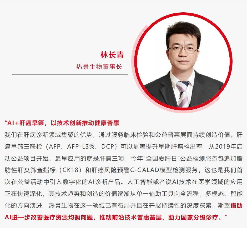 3月18日,值第25個“全國愛肝日”期間,“2025肝癌防治健康中國行——全國愛肝日”大型公益義診活動在全國30省份近百家醫(yī)院的協(xié)同下聯(lián)合展開,惠及近萬人次,公益健康服務包(肝癌三項、GP73、CK18-M30/M65等)由熱景生物支持。2025年升級版“肝病全周期健康檢測服務包”首次融合數(shù)智化AI診斷模型,探索“AI+創(chuàng)新診療”公益新模式,通過智能算法提升肝癌篩查效益,助力實現(xiàn)"篩查-診斷-干預"全流程精準管理,全面推動肝癌防治邁入數(shù)智化新階段。