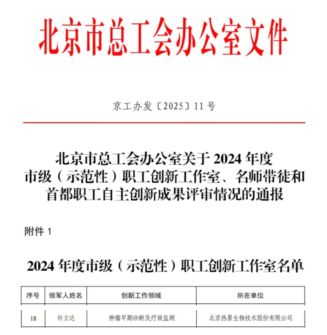近日,北京市總工會發(fā)布《關于2024年度市級(示范性)職工創(chuàng)新工作室、名師帶徒和首都職工自主創(chuàng)新成果評審情況的通報》,熱景生物許立達研究員領軍的“腫瘤早期診斷及療效監(jiān)測”創(chuàng)新團隊榮獲“北京市級職工創(chuàng)新工作室”稱號,該稱號是對工作室在腫瘤精準診斷領域持續(xù)創(chuàng)新與技術(shù)轉(zhuǎn)化卓越貢獻的權(quán)威認可。創(chuàng)新驅(qū)動腫瘤診斷革新該工作室專注于腫瘤早期診斷與療效監(jiān)測技術(shù)的研發(fā),依托公司核心原創(chuàng)技術(shù),成功搭建起獨具特色的多組學診斷技術(shù)平臺,實現(xiàn)外泌體、蛋白、核酸等腫瘤標志物從發(fā)現(xiàn)到臨床轉(zhuǎn)化的貫通,助力腫瘤精準診療。