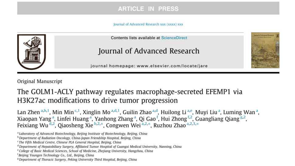 近日,熱景生物參股公司北京堯景基因技術(shù)有限公司(簡稱“堯景基因”)聯(lián)合北京生物技術(shù)研究所、中日友好醫(yī)院、廣西醫(yī)科大學(xué)附屬腫瘤醫(yī)院等多家單位,在《Journal of Advanced Research》雜志發(fā)表重要研究成果,論文題為《The GOLM1-ACLY pathway regulates macrophage-secreted EFEMP1 via H3K27ac modifications to drive tumor progression》。該研究首次闡明巨噬細(xì)胞中 GOLM1-ACLY 軸通過表觀遺傳調(diào)控與細(xì)胞間信號傳導(dǎo)影響腫瘤進(jìn)展的分子機(jī)制,為癌癥治療提供了全新潛在靶點(diǎn)。
