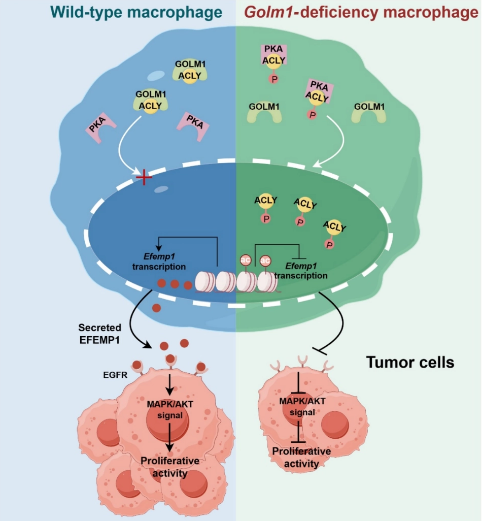 研究結(jié)果表明,GOLM1 在腫瘤相關(guān)巨噬細(xì)胞中高表達(dá);巨噬細(xì)胞中 GOLM1 缺失可抑制腫瘤,并促進(jìn)代謝重編程;本研究中首次證實(shí),GOLM1 可與 ACLY 直接結(jié)合并干擾其在巨噬細(xì)胞中的功能。GOLM1 與 ACLY 的結(jié)合會阻礙上游蛋白激酶 A(PKA)介導(dǎo)的 ACLY 在絲氨酸 455 位點(diǎn)的磷酸化,進(jìn)而導(dǎo)致 ACLY 活性降低;而敲除巨噬細(xì)胞中的 GOLM1基因會增強(qiáng)細(xì)胞核內(nèi) ACLY 的磷酸化水平,從而促進(jìn)組蛋白 H3 第 27 位賴氨酸的乙?;℉3K27ac)。多組學(xué)分析表明,H3K27 的乙?;缴邥M(jìn)一步抑制巨噬細(xì)胞中細(xì)胞外基質(zhì)(ECM)蛋白 EFEMP1 的轉(zhuǎn)錄與釋放,進(jìn)而抑制腫瘤細(xì)胞中 EGFR 的活性及其下游 MAPK 和 AKT 信號通路,最終抑制腫瘤的增殖活性。本研究首次闡明,在巨噬細(xì)胞中GOLM1通過 EFEMP1/EGFR 細(xì)胞間信號傳導(dǎo),影響 ACLY 介導(dǎo)的表觀遺傳調(diào)控,從而調(diào)控腫瘤增殖。這些發(fā)現(xiàn)提示,腫瘤相關(guān)巨噬細(xì)胞(TAMs)中的 GOLM1-ACLY 軸有望成為癌癥治療的潛在靶點(diǎn)。