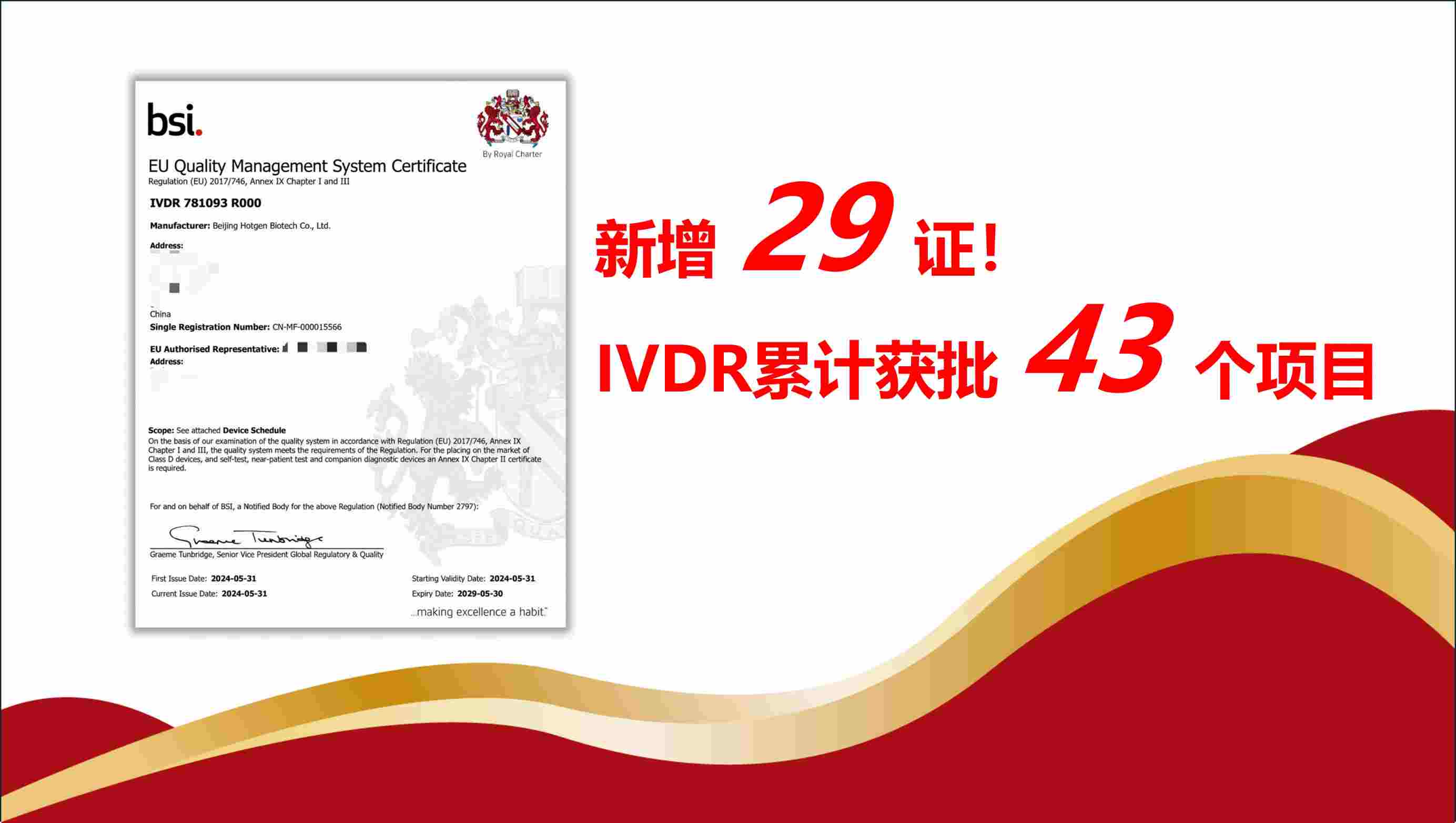 近日,熱景生物在歐盟體外診斷醫(yī)療器械法規(guī)(IVDR)下新增29款診斷產(chǎn)品的CE認(rèn)證。該CEIVDR證書由歐洲最有聲望的認(rèn)證機(jī)構(gòu)之一英國標(biāo)準(zhǔn)協(xié)會(BSI)頒發(fā)。新批準(zhǔn)的29種診斷試劑覆蓋了熱景生物旗下全...